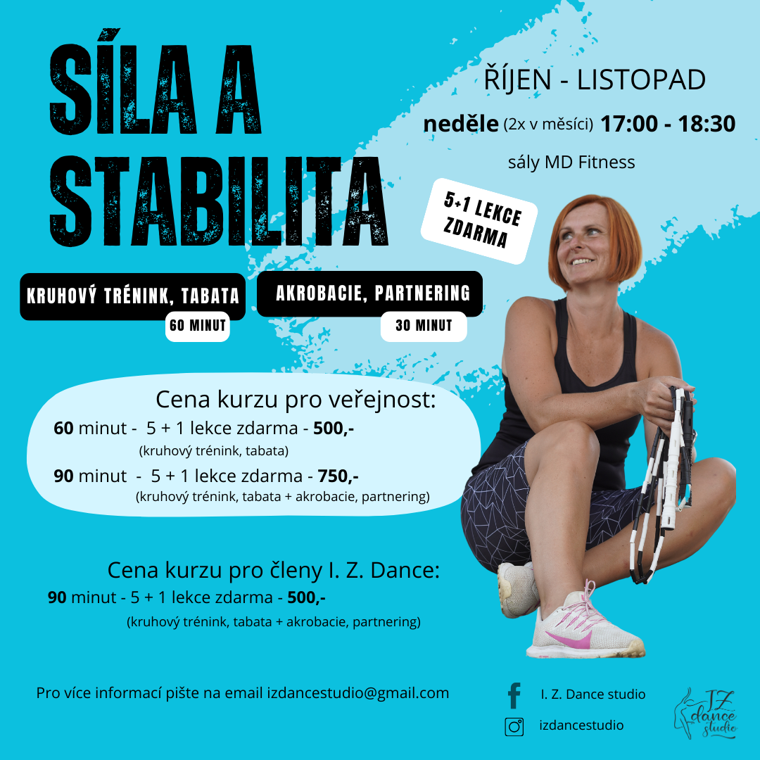Kruháč, tabata, akrobacie a partnering jsou nové možnosti pohybu v I. Z. Dance studiu. Vyberte si ze dvou možností: 60 minut - kruháč a tabata. 90 minut - kruháč, tabata + akrobacie, partnering.