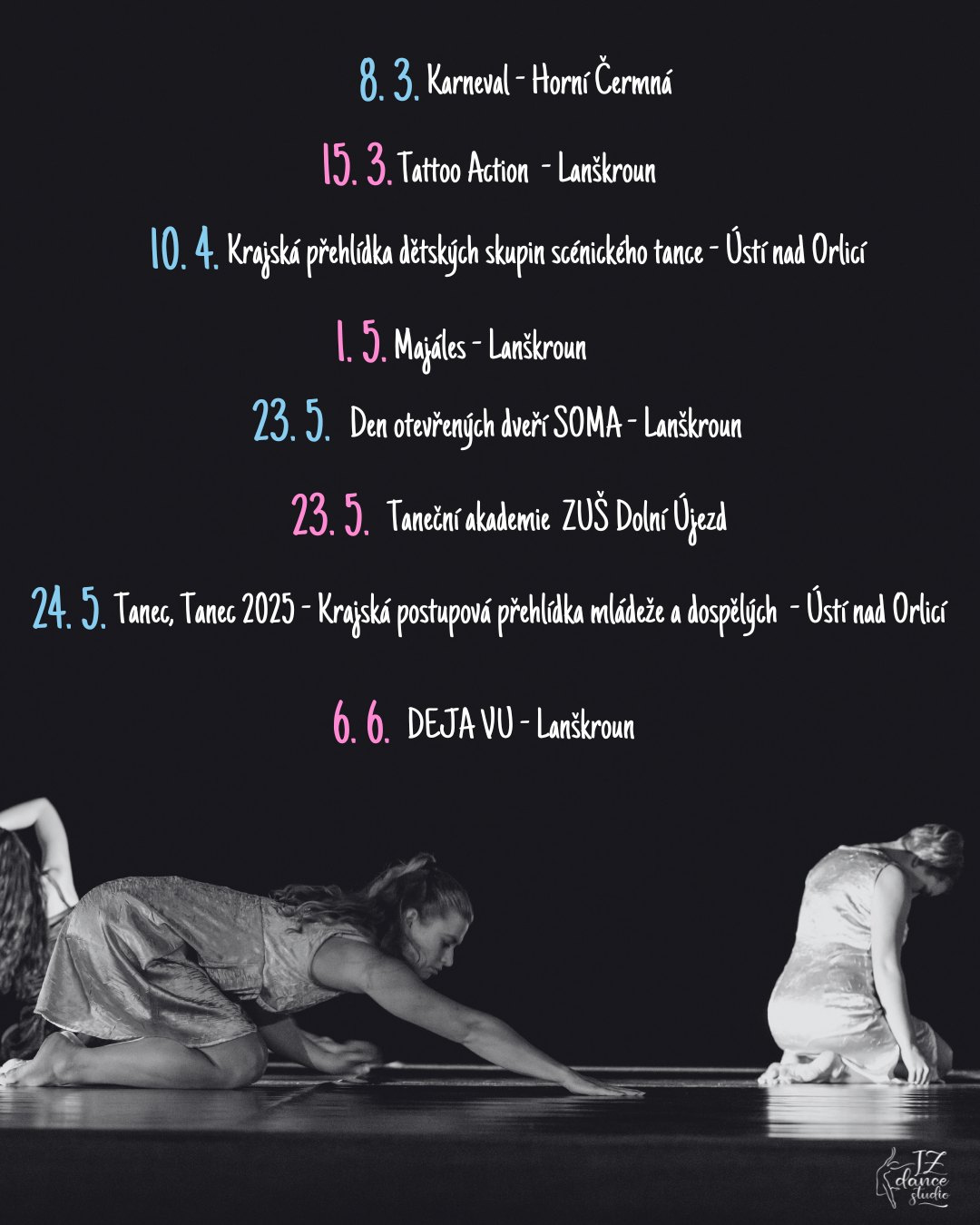 I. Z. Dance studio teď čeká spoustu akcí a soutěží, kde jsme přizváni jako hosté, nebo budeme soupeřit v tanečním umění. Těšíme se na vás.